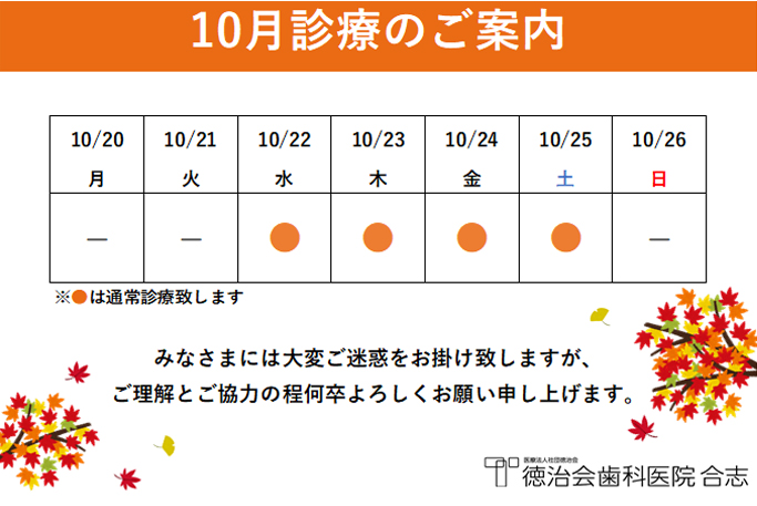 10月20日(月)から26日(日)までの診療のご案内をいたします。 誠に勝手ながら、10月20日(月)・21日(火)は休診とさせていただきます。 また、10月23日は木曜日ですが、終日診療しております。 皆様にはご迷惑をお掛け致しますが、 ご協力とご理解の程何卒よろしくお願い申し上げます。